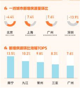 市場供應方面,報告顯示全國新增掛牌房源量環比下跌4.8%。一線城市北京和深圳出現一定程度的環比下跌情況,其中深圳新增掛牌房源量環比下降最為明顯,為-13.9%;上海和廣州新增掛牌房源量環比上漲均超過7%。從全國范圍來看,南寧、九江、常州、三亞和廣東環比上漲形勢備受矚目,其中南寧以13.5%的環比漲幅排名最高。