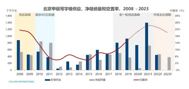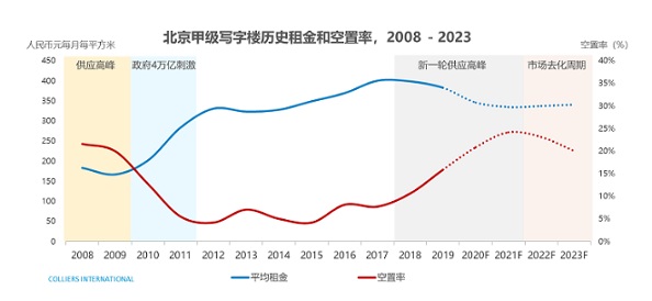 對于2020年全年的預測,高力國際依然延續市場處于三期疊加的判斷,依然維持宏觀經濟增長穩步復蘇,北京疫情防控有效和寫字樓需求中性釋放的三個宏觀基礎條件,并預計供需失衡的態勢仍會加劇并會延續到2021年,以及空置率明年觸頂的研判。在四季度,若新項目如期入市,整體市場單季度新增供應將接近50萬平方米,空置率大概率突破20%。2021年的新增供應將接近140萬平方米,剔除自用的影響,對市場的沖擊大概在110萬平方米。因此,在未來的15個月,北京將迎來近200萬平方米的新增供應,因此我們預計北京的空置率將在2021年觸及最高點,達到接近25%的水平。CBD核心區的中服地塊和麗澤區域的新項目預計將在明年全部入市,2021年將是北京第二輪高供應期的最后一年。在需求端,我們預計四季度會延續三季度持續回暖的態勢,但全年凈吸納量創有歷史記錄以來的新低已經幾乎沒有任何懸念。
