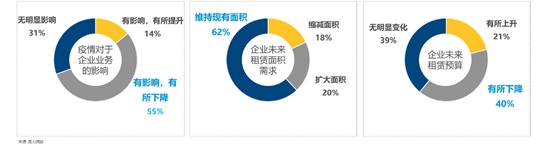 國有企業:“穩”字當頭。疫情對于國有企業的業務影響有限,業務提升或沒有影響的比例高達63%;同時租賃需求以維持現狀為主,86%選擇維持面積,并有半數企業預計維持預算。