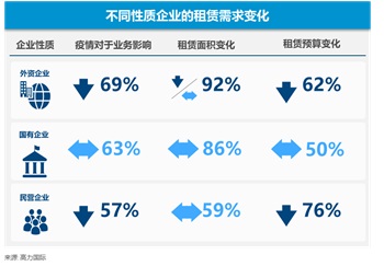 被訪企業中,國企依然“穩”字當頭,外企普遍受沖擊較大,互聯網企業在民企中擴租意愿最強。當我們聚焦到企業性質時,可以看到不同性質的企業受到疫情影響程度有所不同,因此租賃需求和預算的變化也各有不同,其中: