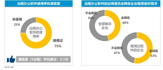 遠程辦公軟件成為辦公新趨勢,企業普遍認為該技術會一定程度降低未來辦公面積需求。在我們調查的企業中,遠程辦公軟件的使用率高達75%。同時,我們發現遠程辦公軟件的使用率在各性質企業與各行業中并沒有顯著的差異。此外,企業對于遠程辦公軟件的使用效果也較為滿意,滿意度平均得分3.7分(5分制)。可以說,此次疫情使得遠程辦公軟件在各行各業中,得到了較為廣泛且有效的應用。那么遠程辦公軟件的應用,對于企業未來辦公面積的需求是否造成了影響?調查結果顯示企業認為遠程辦公軟件會減少辦公租賃需求的比例為46%。而當我們進一步去細分那些使用過遠程辦公軟件的企業時,我們發現這個比例會提高到53%。同時,我們發現對于遠程辦公軟件使用的滿意度,并不會降低企業在租賃面積上的需求。也就是說,當企業使用過遠程辦公軟件后,都會在一定程度上更加認同這樣的技術會降低其未來的辦公面積需求。因此,遠程辦公軟件的廣泛應用確實會在一定程度上改變了企業在辦公面積上的需求。