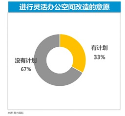 靈活辦公空間設計理念認知度有待進一步提高。在2019年的7月高力國際舉辦的“2019靈活辦公未來趨勢研討會”上,我們就曾指出伴隨著商務行為而產生的辦公場所,經歷了從格子間向開放式空間,從開放式空間向靈活辦公的模式演變。在此次調查中,我們看到企業當前對于靈活辦公空間改造的認知度并不高,進而對于靈活辦公空間改造的意愿并不強,有計劃改造的僅占33%。同時我們發現,相較于國企和民企,外資企業進行靈活辦公空間改造嘗試的意愿也更強為54%,而國企嘗試意愿相對較低僅為14%。在細分行業上,專業服務類企業更愿意進行這樣的嘗試,有一半的企業有意愿嘗試。