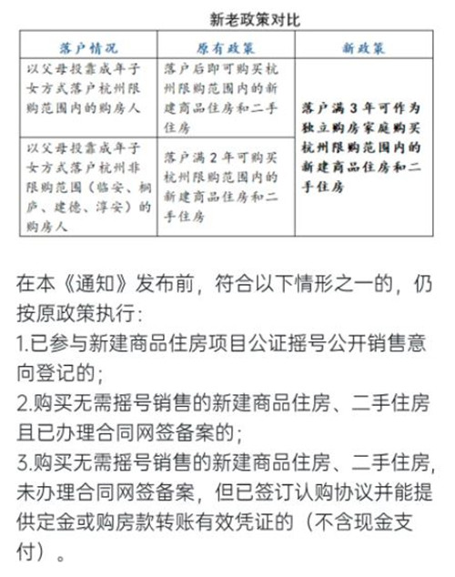此次杭州樓市限購政策再升級。《通知》完善了住房限購政策,明確以父母投靠成年子女方式落戶本市的,須落戶滿3年方可作為獨立購房家庭在本市限購范圍內購買新建商品住房和二手住房。