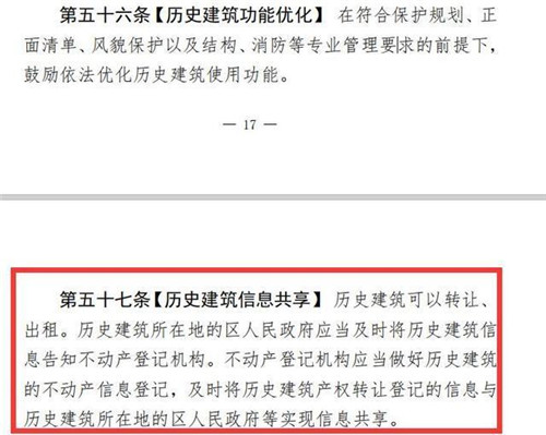 征求意見稿提出,在符合保護規劃、正面清單、風貌保護以及結構、消防等專業管理要求的前提下,鼓勵依法優化歷史建筑使用功能。歷史建筑可以轉讓、出租。歷史建筑所在地的區人民政府應當及時將歷史建筑信息告知不動產登記機構。不動產登記機構應當做好歷史建筑的不動產信息登記,及時將歷史建筑產權轉讓登記的信息與歷史建筑所在地的區人民政府等實現信息共享。