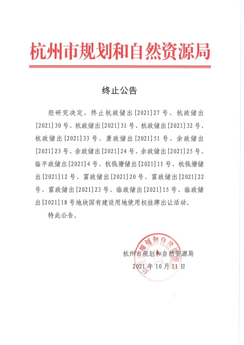 《公告》稱,經(jīng)研究決定,終止杭政儲(chǔ)出[2021]27號(hào)、杭政儲(chǔ)出[2021]30號(hào)、杭政儲(chǔ)出[2021]31號(hào)、杭政儲(chǔ)出[2021]32號(hào)、杭政儲(chǔ)出[2021]33號(hào)、蕭政儲(chǔ)出[2021]51號(hào)、余政儲(chǔ)出[2021]23號(hào)、余政儲(chǔ)出[2021]24號(hào)、余政儲(chǔ)出[2021]25號(hào)、臨平政儲(chǔ)出[2021]4號(hào)、杭錢塘儲(chǔ)出[2021]11號(hào)、杭錢塘儲(chǔ)出[2021]12號(hào)、富政儲(chǔ)出[2021]20號(hào)、富政儲(chǔ)出[2021]22號(hào)、富政儲(chǔ)出[2021]23號(hào)、臨政儲(chǔ)出[2021]15號(hào)、臨政儲(chǔ)出[2021]18號(hào)地塊國(guó)有建設(shè)用地使用權(quán)掛牌出讓活動(dòng)。