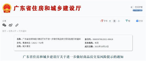 房訊網(wǎng)訊 10月13日,廣東省住房和城鄉(xiāng)建設(shè)廳發(fā)布《廣東省住房和城鄉(xiāng)建設(shè)廳關(guān)于進(jìn)一步做好商品房交易風(fēng)險(xiǎn)提示的通知》,進(jìn)一步促進(jìn)房地產(chǎn)市場(chǎng)平穩(wěn)健康發(fā)展,切實(shí)維護(hù)購(gòu)房者的合法權(quán)益,并研究制定了《廣東省商品房交易風(fēng)險(xiǎn)提示》。
