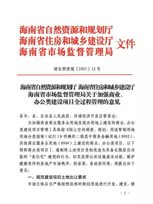 房訊網訊 日前,海南省自然資源和規劃廳、海南省住房和城鄉建設廳、海南省市場監督管理局日前出臺《關于加強商業、辦公類建設項目全過程管理的意見》,從規范建設項目土地出讓要求、嚴格建筑設計要求、加強建設施工和竣工驗收管理、加強銷售登記環節管理等方面提出了一系列具有較強針對性的措施。