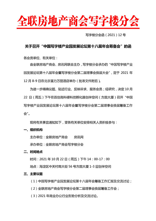 通知顯示,由全聯房地產商會、房訊網聯合主辦,寫字樓分會承辦的"中國寫字樓產業園發展論壇第十八屆年會暨寫字樓分會第二屆理事會換屆大會",將于2021年12月8-9日在北京富力萬麗酒店舉辦。