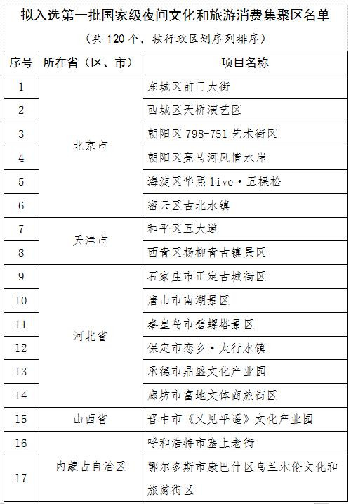 房訊網訊 10月19日,文旅部發布第一批國家級夜間文化和旅游消費集聚區名單的公示,經地方申報、省廳推薦、合規性審查、專家評審、輿情風控、實地考察等方式,擬確定北京市東城區前門大街等120個項目為第一批國家級夜間文化和旅游消費集聚區。公示期為5個工作日(自2021年10月19日至25日)。