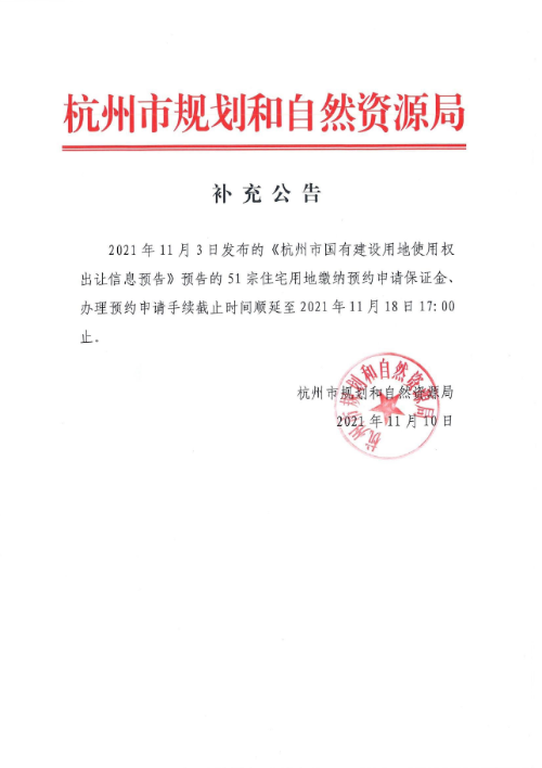房訊網(wǎng)訊 11月10日,杭州市規(guī)劃和自然資源局發(fā)布補(bǔ)充公告稱,11月3日發(fā)布的《杭州市國有建設(shè)用地使用權(quán)出讓信息預(yù)告》的51宗住宅用地,繳納預(yù)約申請保證金、辦理預(yù)約申請手續(xù)截止時間順延至2021年11月18日17:00。