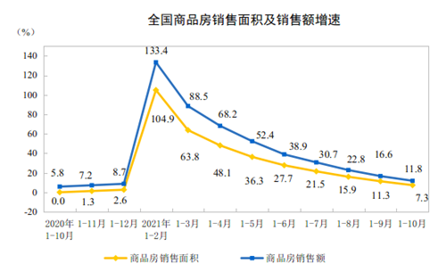 1—10月份,商品房銷售面積143041萬平方米,同比增長7.3%;比2019年1—10月份增長7.3%,兩年平均增長3.6%。其中,住宅銷售面積增長7.1%,辦公樓銷售面積增長2.4%,商業營業用房銷售面積下降0.6%。商品房銷售額147185億元,增長11.8%;比2019年1—10月份增長18.3%,兩年平均增長8.8%。其中,住宅銷售額增長12.7%,辦公樓銷售額下降1.6%,商業營業用房銷售額下降0.6%。