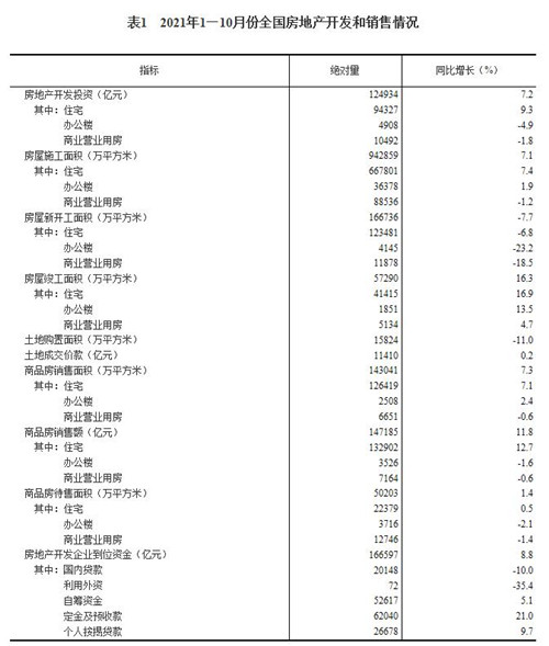 1—10月份,全國房地產開發投資124934億元,同比增長7.2%;比2019年1—10月份增長14.0%,兩年平均增長6.8%。其中,住宅投資94327億元,增長9.3%。