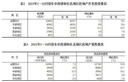 1—10月份,東部地區商品房銷售面積59426萬平方米,同比增長9.0%;銷售額84622億元,增長15.7%。中部地區商品房銷售面積40202萬平方米,增長11.5%;銷售額30042億元,增長14.1%。西部地區商品房銷售面積38160萬平方米,增長2.7%;銷售額28271億元,增長2.6%。東北地區商品房銷售面積5253萬平方米,下降5.4%;銷售額4249億元,下降7.8%。