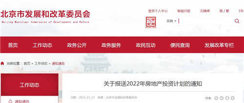 房訊網訊 近日,北京市發改委、住建委發布《關于報送2022年房地產投資計劃的通知》,申報時間為2021年11月22日至12月5日。