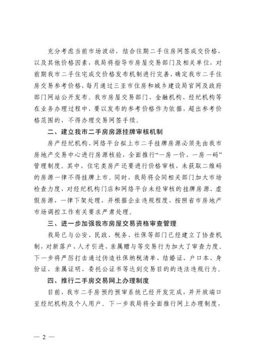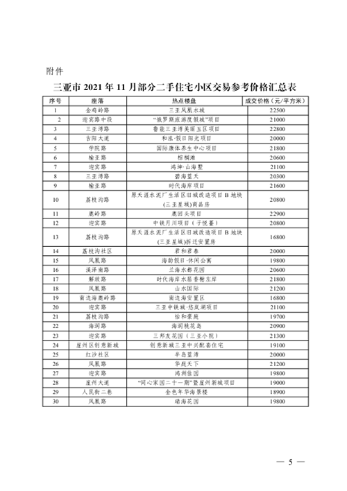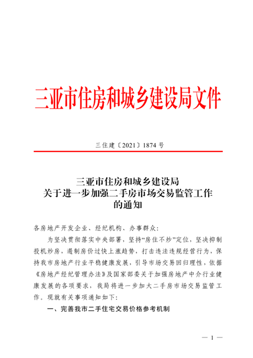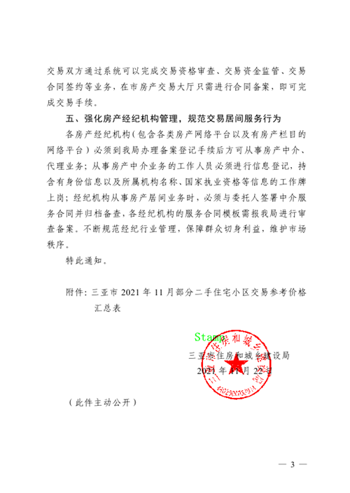 房訊網訊 11月22日,三亞市住房和城鄉建設局發布《關于進一步加強二手房市場交易監管工作的通知》,提出完善三亞市二手住宅成交價格發布機制,確定三亞市二手住房交易參考價格,每月通過三亞市住房和城鄉建設局官網及政府部門網站公開發布。