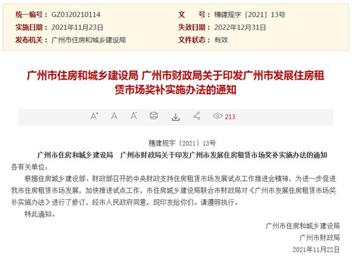 房訊網訊 11月22日,廣州市住房和城鄉建設局和廣州市財政局聯合發布了《廣州市發展住房租賃市場獎補實施辦法》,促進廣州市住房租賃市場發展,加快建設租購并舉的住房制度。