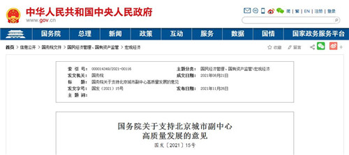 房訊網訊 11月26日,國務院發布關于支持北京城市副中心高質量發展的意見,提出到2025年,城市副中心綠色城市、森林城市、海綿城市、智慧城市、人文城市、宜居城市功能基本形成。到2035年,現代化城市副中心基本建成。