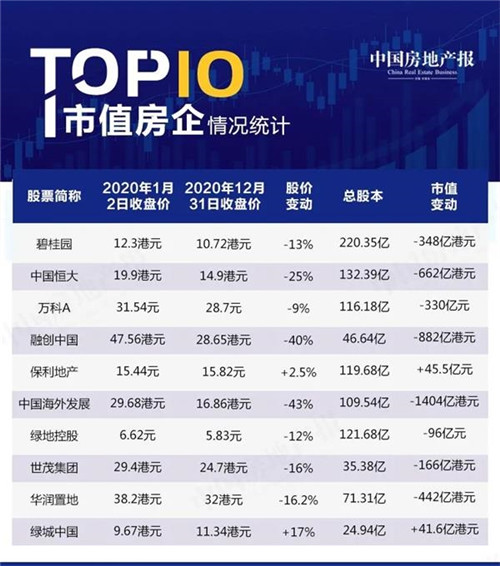 在股價(jià)下跌的8家房企中,跌幅最小的是萬(wàn)科A,從年初的31.54元下降到了年末的28.7元,跌幅約9%,市值縮水了330億元,截至2020年12月31日,總市值仍有3334億元。跌幅最大的是中國(guó)海外發(fā)展,股價(jià)從29.68港元跌到了16.86港元,跌幅達(dá)43%,市值沒(méi)了1404億港元。股價(jià)跌了四成的還有融創(chuàng)中國(guó),一年時(shí)間,市值蒸發(fā)了882億港元。而碧桂園、華潤(rùn)置地、綠地控股、世茂集團(tuán)等公司,跌幅則在12%-25%。