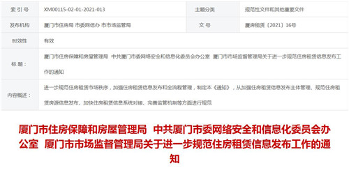 廈門市住房保障和房屋管理局 中共廈門市委網絡安全和信息化委員會辦公室 廈門市市場監督管理局關于進一步規范住房租賃信息發布工作的通知