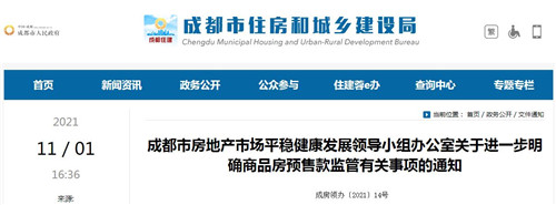 房訊網訊 近日,成都市房地產市場平穩健康發展領導小組辦公室發布《關于進一步明確商品房預售款監管有關事項的通知》,進一步規范市場行為,提高預售資金使用效率,保障預售資金用于工程建設,切實維護人民群眾合法權益,促進我市房地產市場平穩健康發展。
