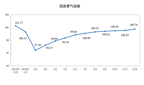 12月份,房地產開發景氣指數(簡稱“國房景氣指數”)為100.76,比11月份提高0.21點。