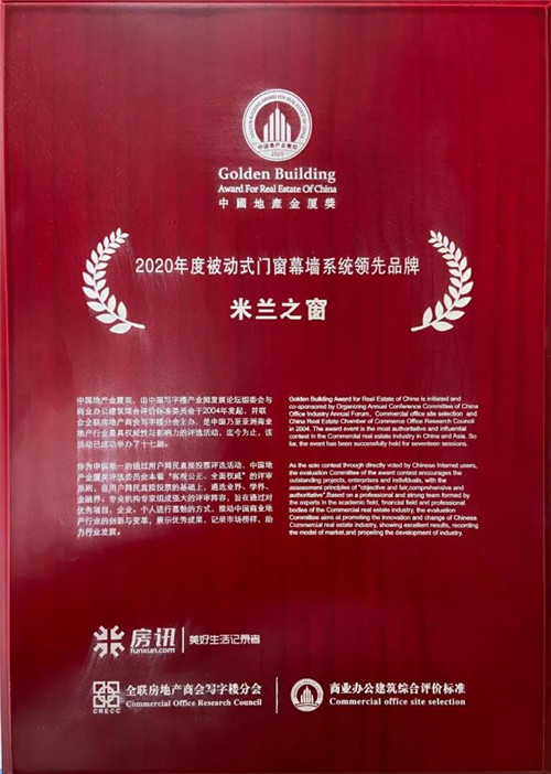 中國寫字樓產(chǎn)業(yè)園發(fā)展論壇第十七屆年會上,2020年(第17屆)中國地產(chǎn)金廈獎揭曉。米蘭之窗再度蟬聯(lián)“2020年度被動式門窗幕墻系統(tǒng)領先品牌獎”。