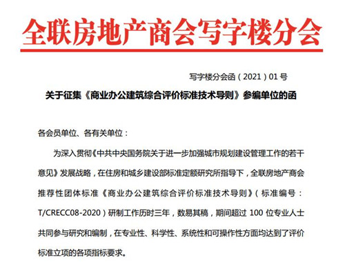 根據部分會員單位強烈要求,為使本標準具有廣泛性和代表性,讓更多業內優秀企業共同參與本標準的編制工作,現面向全行業征集《商業辦公建筑綜合評價標準技術導則》參編單位。現將有關事項通如下: