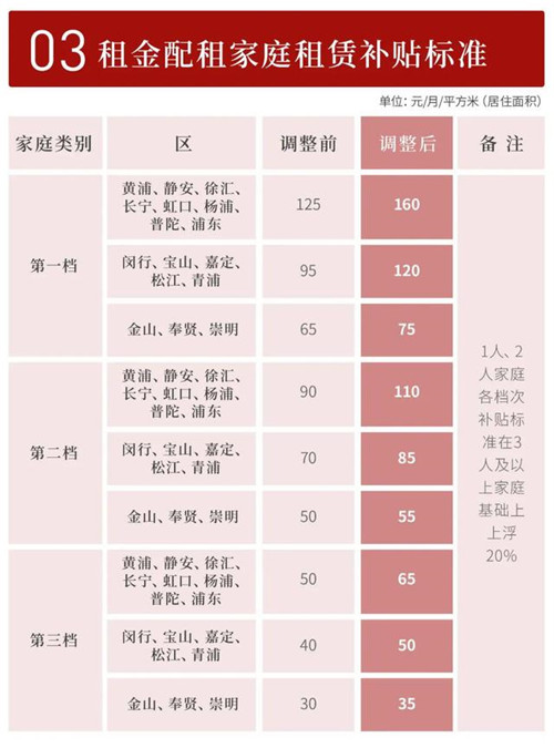 為更好滿足保障家庭基本居住需要,根據(jù)各區(qū)域情況,對租金配租家庭的租賃補(bǔ)貼標(biāo)準(zhǔn)作了對應(yīng)調(diào)整。其中,第一檔家庭每月每平方米居住面積的補(bǔ)貼標(biāo)準(zhǔn),黃浦、徐匯、長寧、靜安、普陀、虹口、楊浦、浦東等8個區(qū)從125元調(diào)整為160元,閔行、寶山、嘉定、松江、青浦等5個區(qū)從95元調(diào)整為120元,金山、奉賢、崇明等3個區(qū)從65元調(diào)整為75元;第二檔、第三檔家庭也作了對應(yīng)調(diào)整。同時,1人、2人家庭各檔次補(bǔ)貼標(biāo)準(zhǔn)仍繼續(xù)在3人及以上家庭基礎(chǔ)上上浮20%。租賃補(bǔ)貼標(biāo)準(zhǔn)調(diào)整后,全市廉租保障家庭的租金補(bǔ)貼水平將總體提升近30%。
