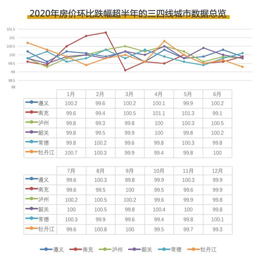 其中,南充和常德2020年房?jī)r(jià)環(huán)比下跌時(shí)長(zhǎng)8個(gè)月,牡丹江2020年房?jī)r(jià)環(huán)比下跌時(shí)長(zhǎng)7個(gè)月,其余遵義、韶關(guān)、瀘州2020年房?jī)r(jià)環(huán)比下跌時(shí)長(zhǎng)6個(gè)月。這一年,這些三四線城市究竟經(jīng)歷了什么?