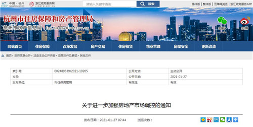房訊網訊 1月27日,杭州市房地產市場平穩健康發展領導小組辦公室發布《關于進一步加強房地產市場調控的通知》,從住房限購、住房限售、稅收調節和無房家庭認定標準及高層次人才優先購房政策等方面進一步加強調控。