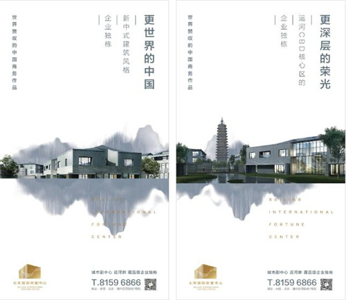 “更世界的中國、更深層的榮光、更創新的傳承、更長青的基業”,哲理型的文案語境,將北京國際財富中心的新中式建筑風格、城市核心企業獨棟、國際大師規劃設計、稀缺黑洞石立面等價值點巧妙輸出,并通過水墨畫風格的廣告畫面,展示中國商務作品的如詩之美。