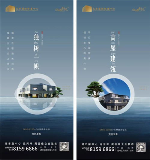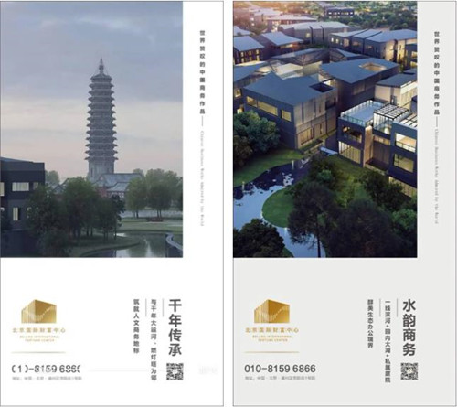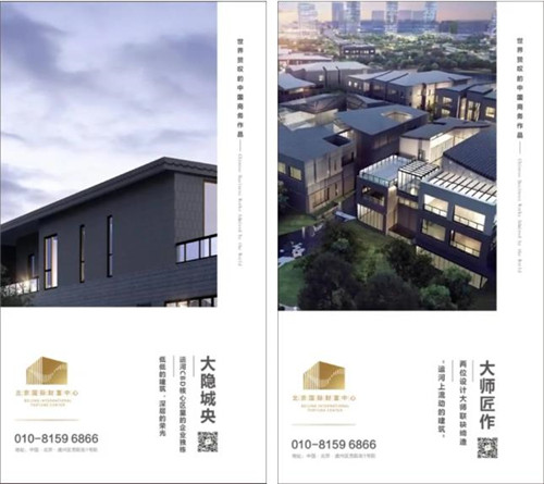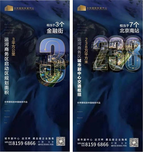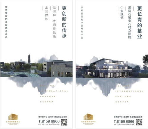 大隱城央、大師匠作、千年傳承、水韻商務、低密藏品、蘊涵西東、基業長青、系出名門……簡潔而充滿氣勢的文案語境,將北京國際財富中心的各個價值點再一次輸出,并配以美輪美奐的效果圖或現場照片,給目標客戶以帶入感的體驗。