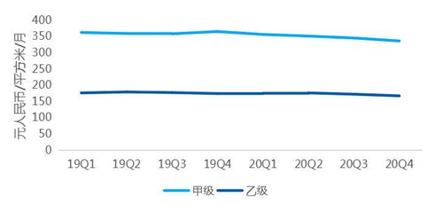 根據貝殼研究院監測,2020年末,代表性甲級寫字樓每月平均凈有效租金為336元每平方米(不含物業費),比3季度末下跌2.6%,比去年同期下跌7.9%。代表性乙級寫字樓每月平均凈有效租金為167元每平方米(不含物業費),比3季度末下降2.9%,比去年同期下降4.0%。甲級寫字樓租金同比降幅超過乙級寫字樓租金同比降幅近一倍。
