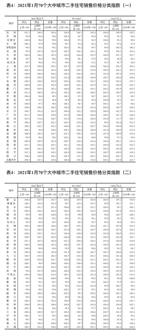 2月23日,國家統計局發布2021年1月70個大中城市商品住宅銷售價格變動情況。從全國70個大中城市房價數據看,2021年1月,70個大中城市中有53個城市的新建商品住宅價格上漲,較去年12月增加11個;二手房方面,70個大中城市中房價上漲的城市數量有49個,較去年12月同樣增加11個。