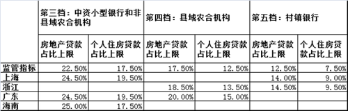 其中,第一檔為中資大型銀行,房地產貸款和個人住房貸款占比上限分別為40%、32.5%;第二檔為中資中型銀行,兩項占比上限分別為27.5%、20%;第三檔中資小型銀行和非縣域農合機構,兩項占比上限分別為22.5%、17.5%;第四檔縣域農合機構,兩項占比上限分別為17.5%、12.5%;第五檔村鎮銀行,上限分別為12.5%、7.5%。