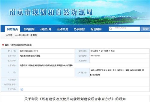 房訊網訊 3月10日,南京市規劃和自然資源局南京市城鄉建設委員會發布了《既有建筑改變使用功能規劃建設聯合審查辦法》的通知,4月9日起正式施行。