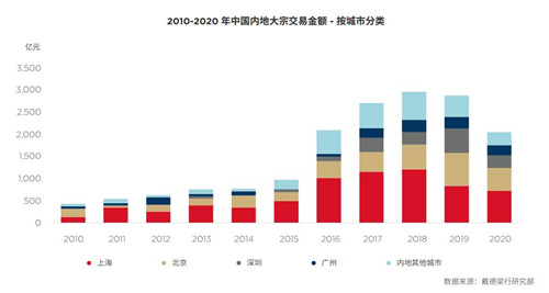 根據(jù)戴德梁行研究部數(shù)據(jù),在全球疫情蔓延與經(jīng)濟(jì)不確定性增強(qiáng)的挑戰(zhàn)下,2020 年中國(guó)內(nèi)地不動(dòng)產(chǎn)大宗交易市場(chǎng)仍然保持相對(duì)活躍,全年錄得交易額 2047 億元人民幣。盡管交易金額為近五年內(nèi)的最低值,但較2019年僅下降 29%,整體表現(xiàn)好于市場(chǎng)普遍預(yù)期。