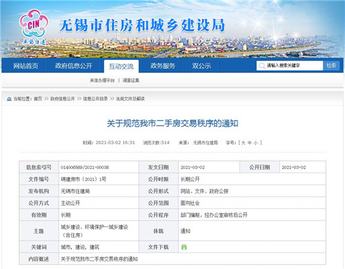 房訊網訊 3月2日,無錫市住房和城鄉建設局發布《關于規范我市二手房交易秩序的通知》,提出從開展房地產市場秩序整頓工作、規范二手房信息發布行為、建立二手住房價格信息發布機制三個方面規范二手房市場秩序。