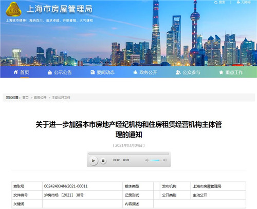 房訊網(wǎng)訊 3月4日,上海市房屋管理局發(fā)布《關(guān)于進(jìn)一步加強(qiáng)本市房地產(chǎn)經(jīng)紀(jì)機(jī)構(gòu)和住房租賃經(jīng)營機(jī)構(gòu)主體管理的通知》,提出加強(qiáng)房地產(chǎn)經(jīng)紀(jì)機(jī)構(gòu)備案管理、加強(qiáng)住房租賃經(jīng)營機(jī)構(gòu)開業(yè)報告(信息記載)管理、加強(qiáng)經(jīng)營主體入網(wǎng)認(rèn)證管理、建立健全行業(yè)信用體系和加強(qiáng)從業(yè)主體管理信息化支撐等五方面措施。