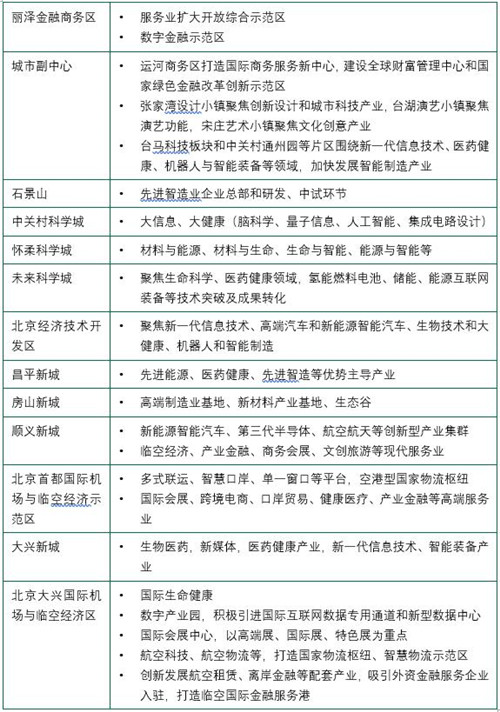 更詳細(xì)地闡述重點區(qū)域產(chǎn)業(yè)/功能定位,重點突出"兩區(qū)"(國家服務(wù)業(yè)擴大開放綜合示范區(qū)和中國(北京)自由貿(mào)易試驗區(qū))、城市副中心和"三城一區(qū)"(中關(guān)村科學(xué)城、懷柔科學(xué)城、未來科學(xué)城和北京經(jīng)濟技術(shù)開發(fā)區(qū))的產(chǎn)業(yè)承載功能;