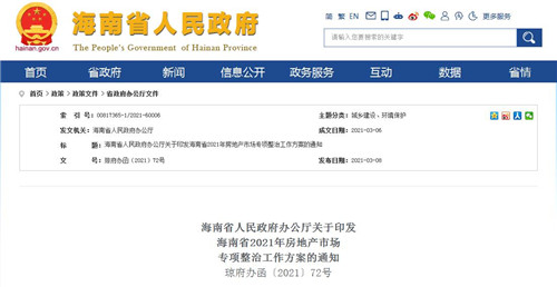 《海南省2021年房地產市場專項整治工作方案》已經省政府同意,現印發給你們,請認真組織實施。