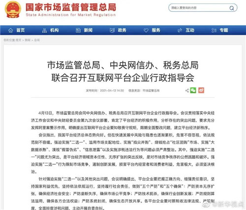 4月13日,市場監管總局會同中央網信辦、稅務總局召開互聯網平臺企業行政指導會。會議貫徹落實中央經濟工作會議和中央財經委員會第九次會議部署,肯定了平臺經濟的積極作用,分析存在的突出問題,要求充分發揮阿里案警示作用,明確提出互聯網平臺企業要知敬畏守規矩,限期全面整改問題,建立平臺經濟新秩序。
