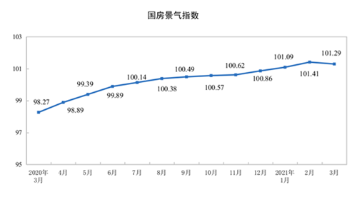 3月份,房地產開發景氣指數(簡稱“國房景氣指數”)為101.29。