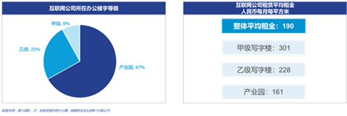 高力國際在整理了北京約150家頭部互聯網科技公司在京辦公租賃情況后發現,當前頭部互聯網公司辦公面積(包含自用和租賃面積)共約525萬平方米,其中前20的公司辦公面積約422萬平方米,占總互聯網公司辦公面積的80%。有42%的互聯網公司位于上地,位于東西兩大組團內的互聯網企業占比高達72%。同時,互聯網公司更加集中于產業園市場,有67%的互聯網公司位于產業園內,位于甲級寫字樓的比例僅8%。在租金方面,互聯網科技公司目前平均租金水平相對較低,平均租金約190元每月每平米,低于整體辦公市場223元每月每平米的水平。