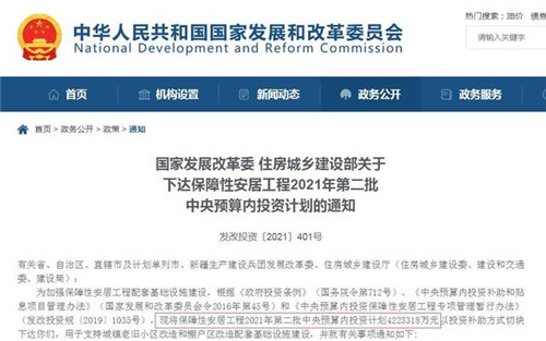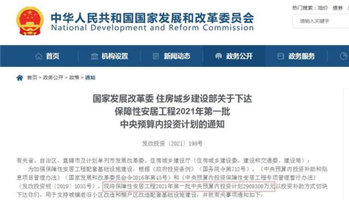 中新經緯客戶端查詢發現,此前的2021年2月22日,國家發改委與住建部聯合印發《關于下達保障性安居工程2021年第一批中央預算內投資計劃的通知》。當時的《通知》顯示,下達中央預算內投資296.93億元支持城鎮老舊小區改造、棚戶區改造等保障性安居工程配套基礎設施建設。其中,安排194.98億元支持城鎮老舊小區配套基礎設施建設,安排101.95億元支持棚戶區改造配套基礎設施建設。