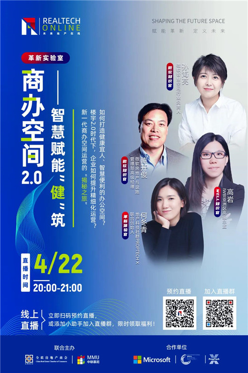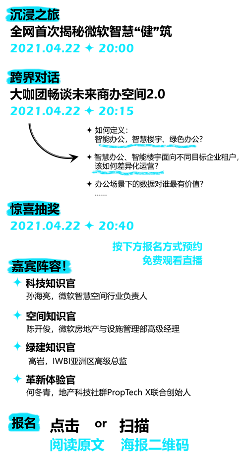 【革新實驗室】2021年首期直播,將帶您深入商辦領域——探討在存量運營關鍵期,商辦開發商、業主及運營商應如何“快、準、穩”跨入智慧綠色“健”筑時代,沖破“空置率迷霧”。直播特邀微軟智慧空間及房地產與設施管理部負責人、國際WELL建筑研究院高級總監及新銳地產科技社群創始人組成大咖團,以多視角智慧碰撞,分享切身經驗和行業洞察。更有革新體驗官上線,全網首次帶大家走進全球頂級人工智能企業的智慧辦公寫字樓!