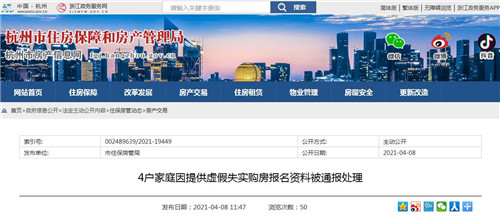 房訊網訊 4月8日,杭州市住房保障和房產管理局發布通報,對在商品住房公證搖號登記過程中提供虛假購房報名資料的4戶家庭作出了“一年內不再受理限購查檔申請”的通報處理。