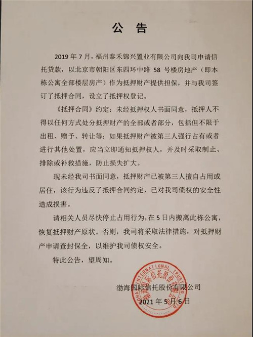 泰禾北京公館將被查封?渤海信托:根據(jù)委托人指令出具了相關(guān)公告