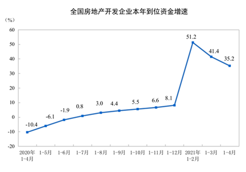 1—4月份,全國房地產開發投資40240億元,同比增長21.6%;比2019年1—4月份增長17.6%,兩年平均增長8.4%。其中,住宅投資30162億元,增長24.4%。