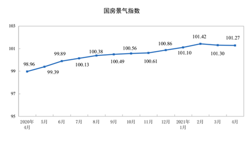 4月份,房地產開發景氣指數(簡稱“國房景氣指數”)為101.27。